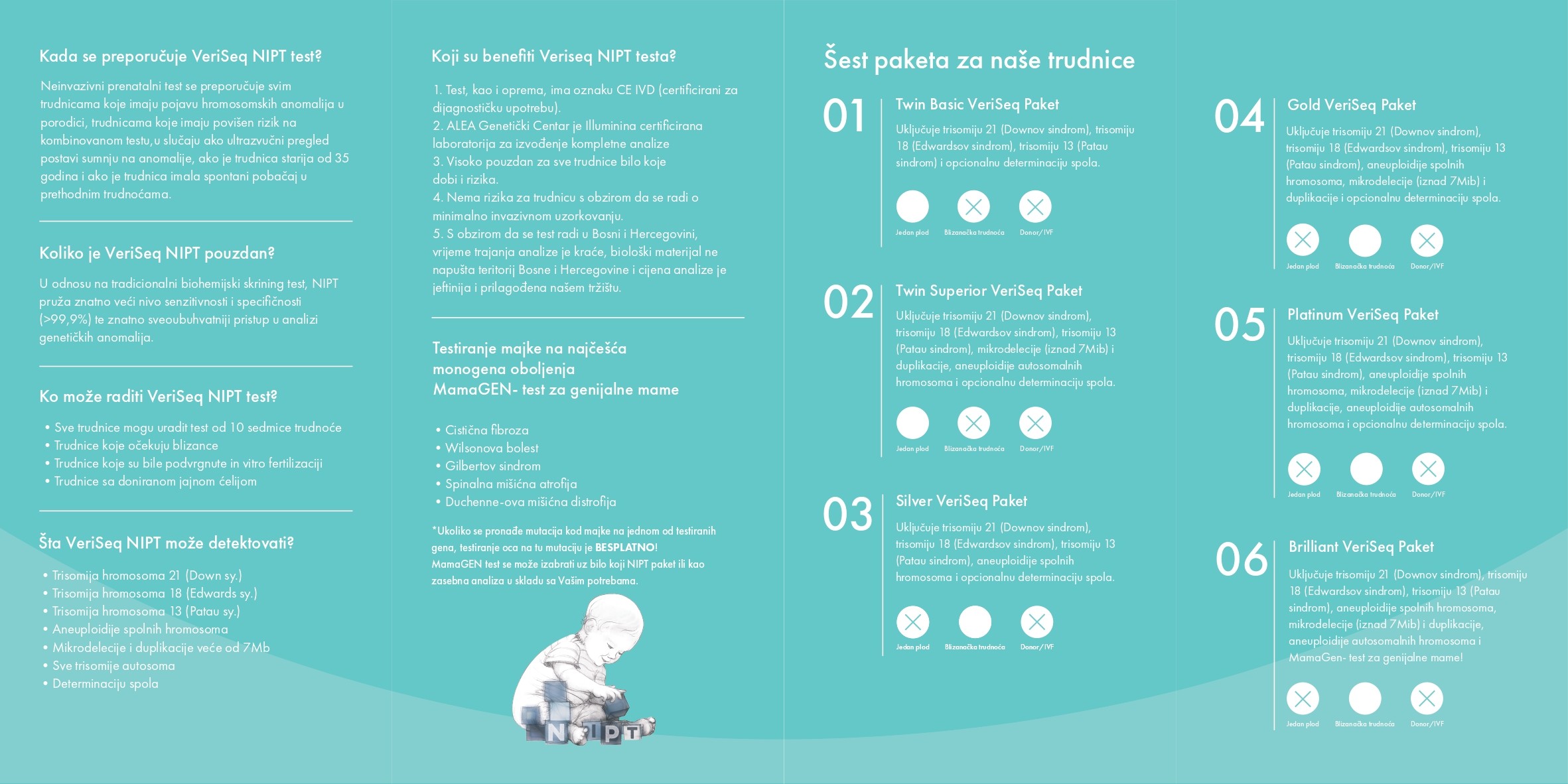 VeriSeq NIPT test omogućava pouzdano otkrivanje hromosomskih abnormalnosti od 10. sedmice trudnoće – uključujući Down, Edwards i Patau sindrom. Analiza se vrši lokalno, bez slanja uzorka van BiH.